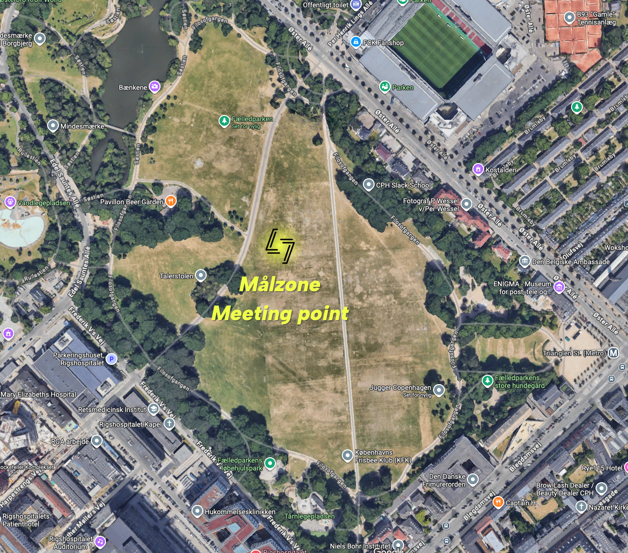 Når du har krydset målstregen og fået din medalje, skal du humpe hen til vores lille fejringsstation i Fælledparken (Se lokation på kortet herunder).